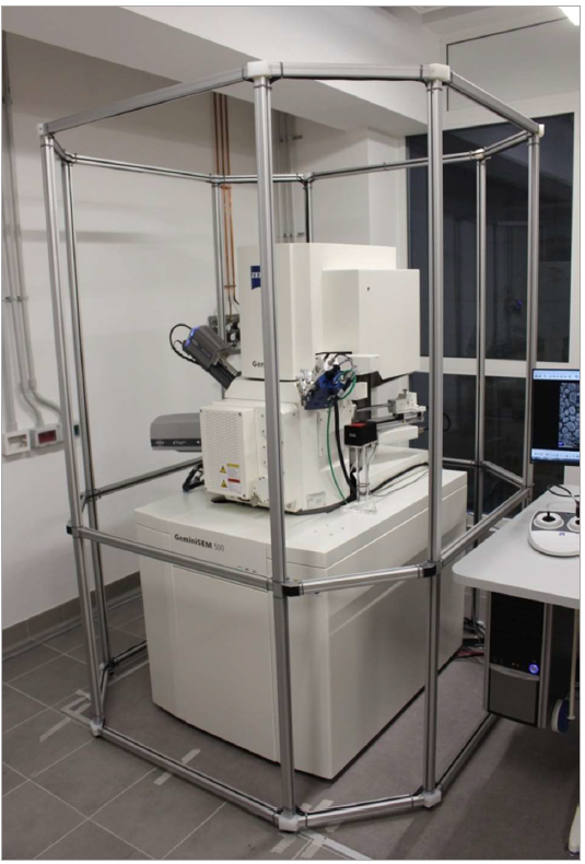 The Spicer System distributed by Herzan can be seamlessly integrated within the room of a lab or surrounding the profile of the SEM or TEM by utilizing a specifically designed frame.