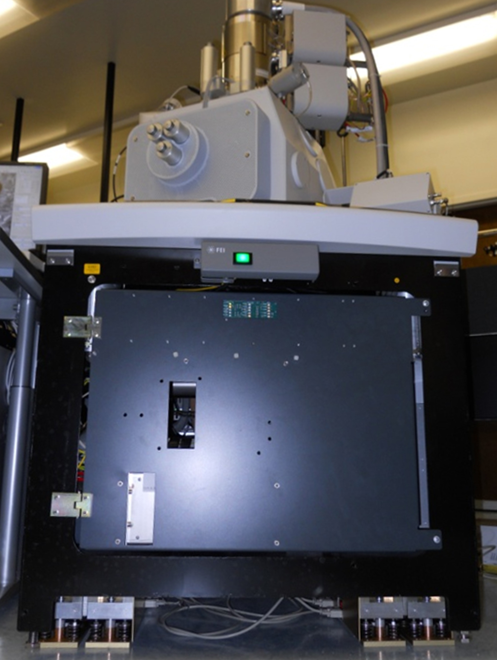 The Zewail Group operating a Quanta FEG 650 interfaced with a custom optical set-up to enable ultrafast electron microscopy imaging. Feeding laser into SEM chamber requires positional stability within a few micrometers, so SEM internal air isolation was not in use.